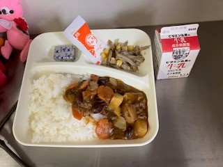 今日の給食は、牛肉と金時豆のカレーライス、牛乳、ごぼうサラダ(ノンエッグドレッシング)、固形チーズ、です。