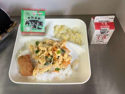 今日の給食は、カツ丼、牛乳、はくさいの甘酢あえ、ソフト黒豆、です。