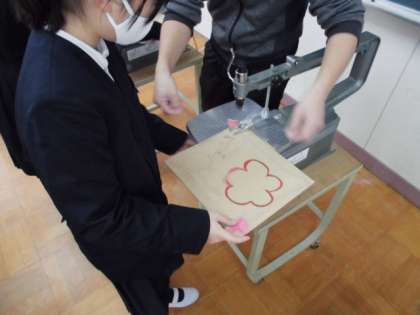 5年生は図画工作で電動のこぎりを使って、ベニヤ板にデザインした形にカットしていました。板が暴れないよう、ゆっくりと板を動かしながら落ち着いて取り組んでいました(^^)/