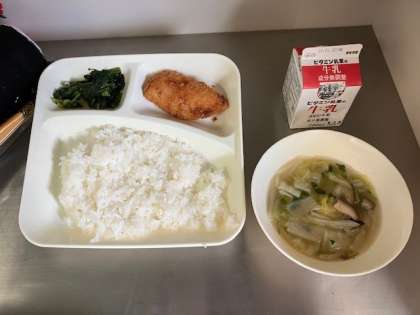 今日の給食は、ごはん、牛乳、たらフライ、うすくず汁、ほうれんそうのおひがし、です。