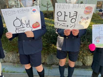 今日のあいさつ運動 公開日 2024/02/08 更新日 2024/02/08 学校日記 今日のあいさつ運動は韓国・朝鮮語で「おはよう」です。「안녕하세요?(アンニョンハセヨ)」の気軽に使えるあいさつで、友だちや親しい間柄で使われ、朝昼晩いつでも使えるあいさつです。「さよなら」の意味もあり、朝のあいさつや別れ際にも使えるそうです。ただ、年齢のわからない方や初対面の方には使わないので、ご注意を。 いいね(0)