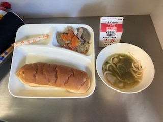 今日の給食は、おさつパン、牛乳、豚肉とごぼうの煮もの、なにわうどん、棒チーズ、です。