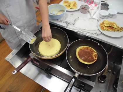 今回はみんなでホットケーキを作りました。作り方はシンプルですが、生地を焦がさないように気を付けて焼いていました(^^)/