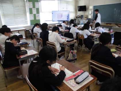 5年生は、算数で立体的な図形について考えていました。電子黒板を使って学習していました。