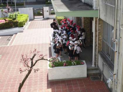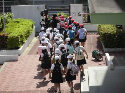 今日は、3・4年生の遠足です。先生の話を聞き、元気に出発しました。