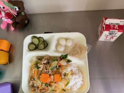 今日の給食は、豚丼、きゅうりの梅風味、白玉だんご、きなこ、牛乳でした。