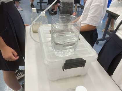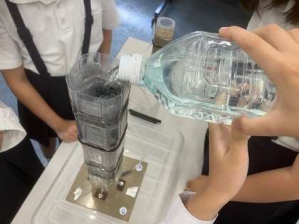 さらに、ろ過した水からにおいを取る実験です。大きな工場を再現しています。