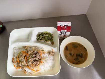 豚ひき肉とにらのそぼろ丼、じゃがいものみそ汁、さんどまめのごまあえ、ご飯、牛乳でした。