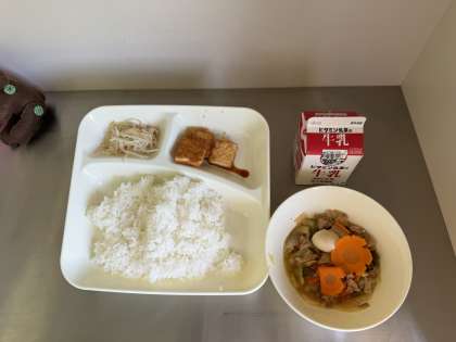 今日の給食は、八宝菜、あつあげのピリ辛じょうゆかけ、もやしの中華あえ、ごはん、牛乳でした。