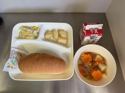 今日の給食は、コッペパン、アプリコットジャム、牛乳、いかてんぷら、フレッシュトマトのスープ煮、キャベツとコーンのサラダです。