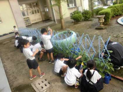 1年生の育てている朝顔のつるが巻き始めました。毎日お水をあげています。