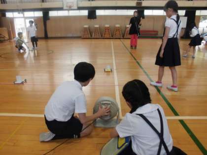 3年生は、理科で風のはたらきを調べていました。実際に実験することで、どのくらいの違いがあるのかを数字にして確認していました。