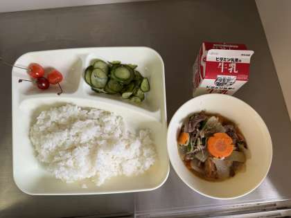 今日の給食は、ごはん、牛乳、牛肉と野菜のいため煮、きゅうりのしょうがづけ、さくらんぼでした。