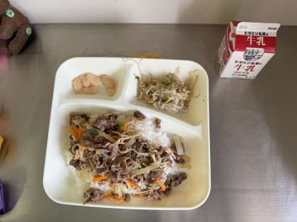 今日の給食は、牛丼、牛乳、もやしとピーマンのごまいため、大福豆の煮ものです。