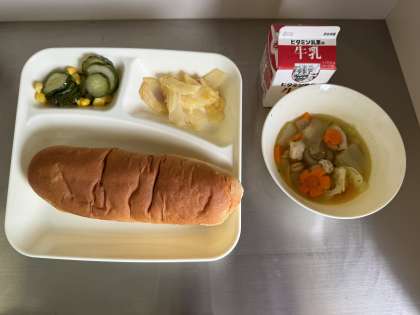 今日の給食は、黒糖パン、牛乳、鶏肉とてぼ豆のスープ煮、ベーコンとじゃがいものチーズ焼き、きゅうりとコーンのサラダでした。