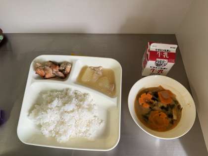 今日の給食は、ごはん、牛乳、さけのしょうゆ風味焼き、みそ汁、とうがんの煮ものでした。