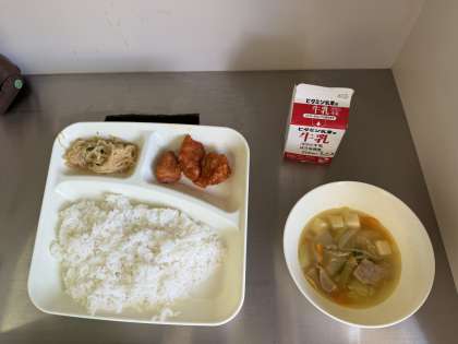 今日の給食は、ごはん、ヤンニョムチキン、牛乳、とうふのスープ、切干しだいこんのナムルです。