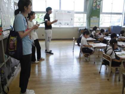 1年1組では道徳をしていました。オオカミ少年の話を教材に、嘘と正直について考えていました。2組では図工で「ならべてみつけて」をしていました。様々な材料を並べてできる形を楽しんでいました。