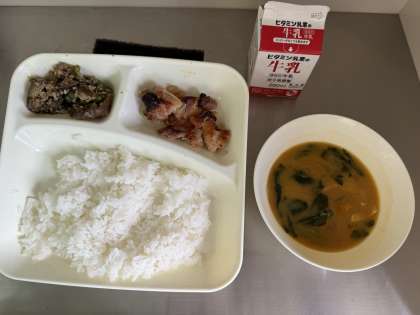 今日の給食は、ごはん、牛乳、鶏肉のてり焼き、かぼちゃのみそ汁、なすのそぼろいためです。