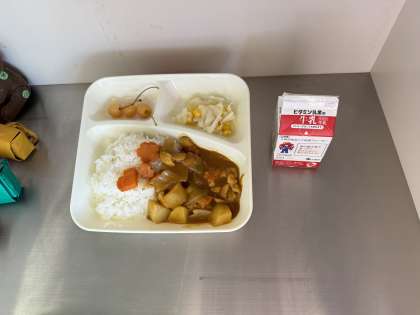 今日の給食は、チキンカレーライス、牛乳、キャベツとコーンのサラダ、さくらんぼ(缶)です。