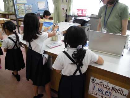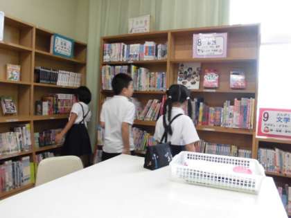 1年1組では図書室で本を選んでいました。2学期になり、続きの本を選ぶ子や友だちから勧められた本を選ぶ子が増えてきました。