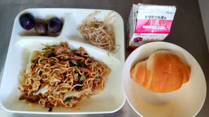 今日の給食は、ミニコッペパン、牛乳、オイスターソース焼きそば、もやしのしょうがづけ、ぶどう(巨峰)です。