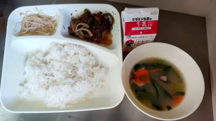 今日の給食は、ごはん、牛乳、プルコギ、トック、もやしのナムルです。