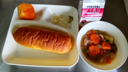 パンプキンパン、牛乳、鶏肉とさつまいものシチュー、はくさいのピクルス、かき(平核無柿)です。