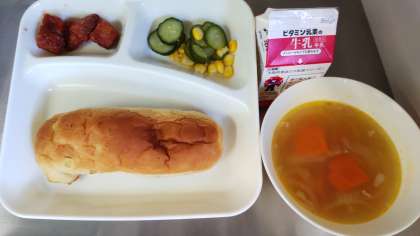 今日の給食は、おさつパン、牛乳、まぐろのオーロラ煮、スープ、きゅうりとコーンのサラダです。