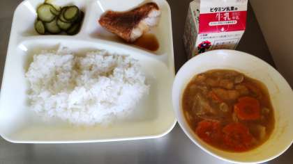 今日の給食は、ごはん、牛乳、あかうおのしょうゆだれかけ、豚汁、きゅうりのゆず風味です。