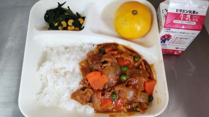 今日の給食は、ポークカレーライス、牛乳、ほうれんそうのソテー、みかんです。