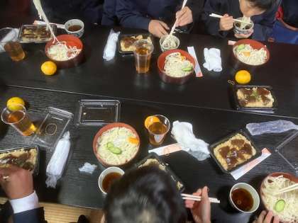 8日 修学旅行 昼食 公開日 2024/11/08 更新日 2024/11/08 学校日記 鳥羽水族館の体験活動を終えて、宿舎「海月」に戻りました。 昼食です。 メニュー「伊勢うどん」と「カツオの海鮮飯」 とても豪華です。 「伊勢うどん」もご当地本番の「伊勢うどん」です。 感謝していただきます! いいね(0)