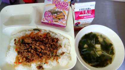 2年生に感想をもらいました。「そぼろのお肉美味しい。わかめスープも美味しかった。」とのこと。ビビンバはどの学年にも人気メニューのようです。