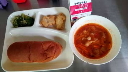 今日の給食は白身魚のフリッター、ミネストローネ、ブロッコリーのサラダ、牛乳、黒糖パンでした。
