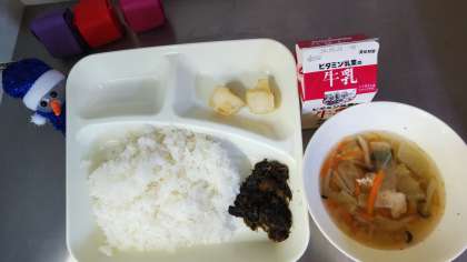 今日の給食は、ごはん、牛乳、いかてんぷら、五目汁、のりのつくだ煮です。