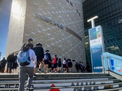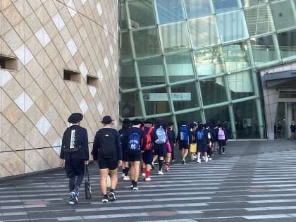 6年生は社会見学に来ています。学校を出発して、歴史博物館に到着しました。今から館内の説明を受けます。