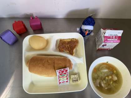 今日の給食は、コッペパン、バター、牛乳、ツナポテトオムレツ、スープ、白桃(缶)です。オムレツはケチャップをかけて頂きます。
