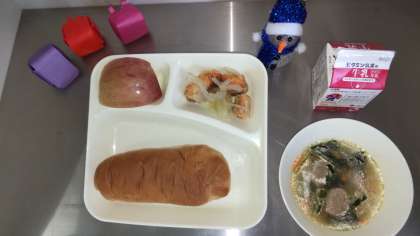 黒糖パン、牛乳、さけのマリネ、肉だんごと押麦のスープ、りんごです。