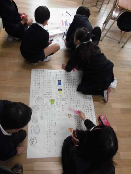 4年生は新聞を使っていました。国語の教材や係活動などからテーマを決め、アンケートをしたり、グラフにまとめたりして、見ている人がわかりやすいように工夫をして書いていました。