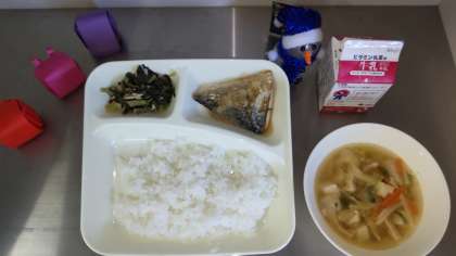 今日の給食は、ごはん、牛乳、さばのおろしじょうゆかけ、五目汁、こまつなの煮びたしです。
