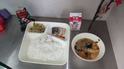 今日の給食は、ごはん、牛乳、さごしのしょうゆだれかけ、みそ汁、キャベツの赤じそあえです。