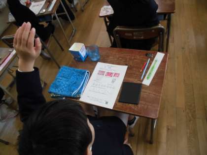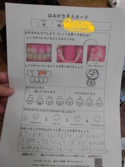 2年生は、歯磨き指導がありました。いつもの歯磨きで取れていない歯垢を確認し、丁寧に歯を磨いていました。