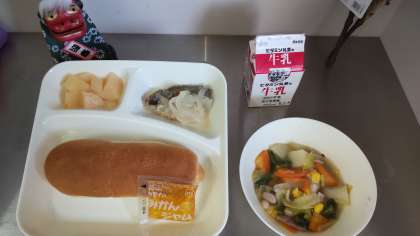 今日の給食は、コッペパン、みかんジャム、牛乳、あじのレモンマリネ、てぼ豆のスープ煮、白桃(カット缶)です。