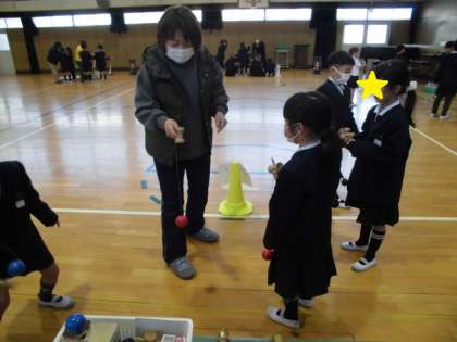 けん玉やコマまわしは、巻き方や遊び方が難しく苦戦していました。