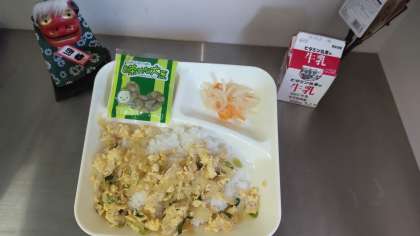 今日の給食は、親子丼、牛乳、紅白なます、まっ茶大豆です。