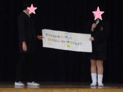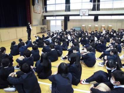 今週も全校朝会から始まります。校長先生の話やあいさつ運動のめあて、看護当番の先生からの質問などがありました。