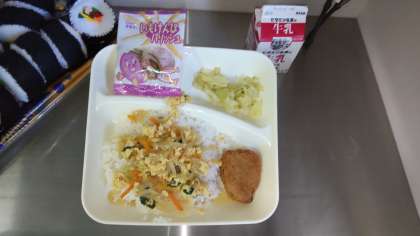 今日の給食は、カツ丼、牛乳、キャベツの梅風味、いもけんぴフィッシュです。