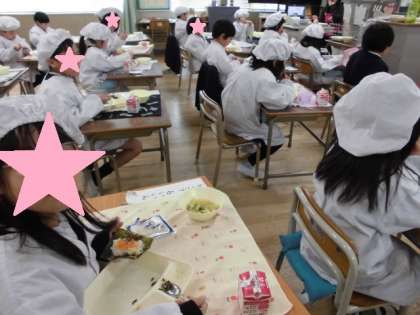 1年生の給食の様子です。1年間でおかずを入れるもの上手になりました。