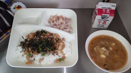 今日の給食は、鶏ごぼうご飯、牛乳、みそ汁、焼きれんこんです。