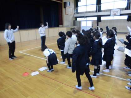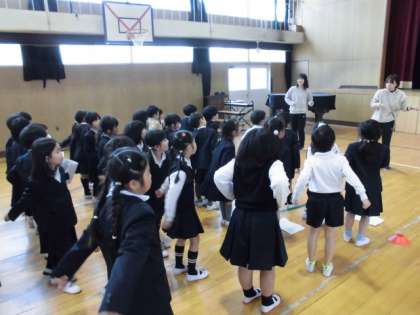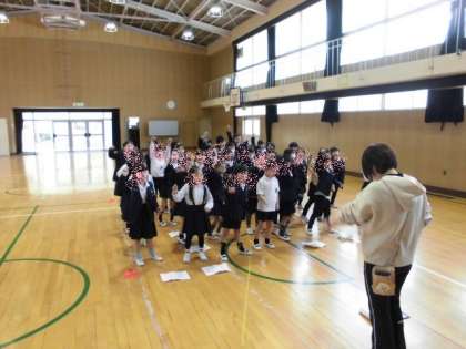 1年生は、6年生卒業を祝う会の練習をしていました。初めての祝う会で、場所やタイミングの確認をしていました。元気に歌っていました。